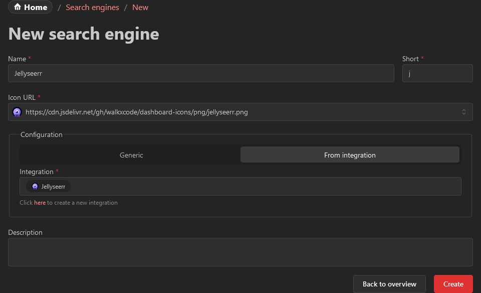 To start, create a new integration of the type Overseerr or `Jellyseerr``. Next, create a new search engine and choose the option "From integration":